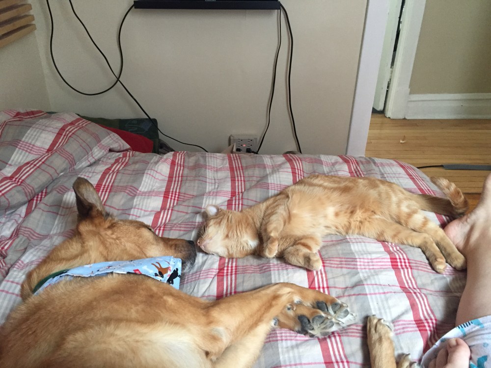 And here we are. 14 years later. DiDi passed of cancer a year ago. We have a cat that is a little obsessed with Pigeon. Pigeon’s much older. She went blind at about age 5. She’s either broken off her teeth over the years or they’ve pulled them so she’s left with a mouth of black gums (it’s her breed), one eye that is sort of sinking into her head while the other is a pearly white, and 3 bad legs from a massive stroke she suffered while Tara was home and I was away for work. She gets confused and she sometimes gets stuck behind a door. But she knows where the kitchen is and where the kitty litter box is. She knows the sound of her leash and what it sounds like when we open the refrigerator. And she knows the sound of a bag of chips opening from 600 yards away. She knows how to get you to pet her. And she knows that when my mom is around so are the ‘Nilla Wafers (I stopped fighting that a long time ago).